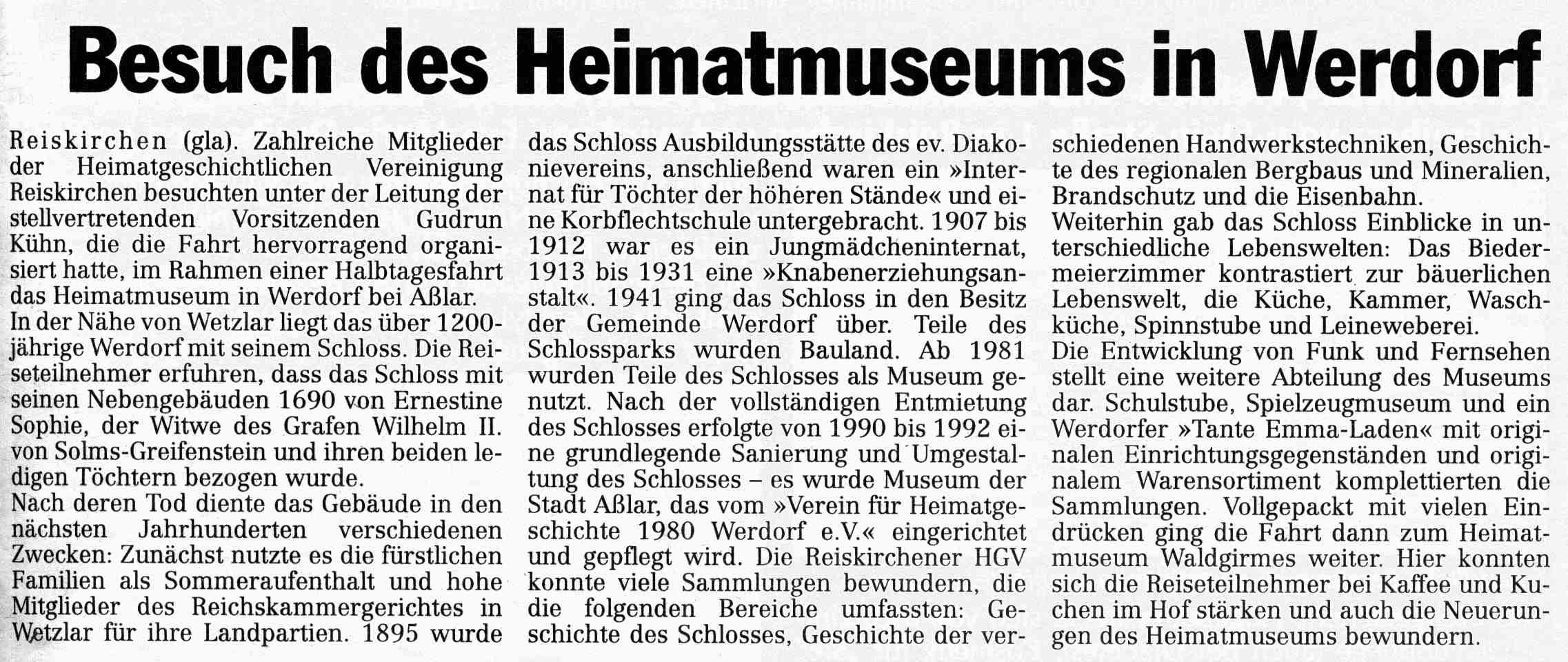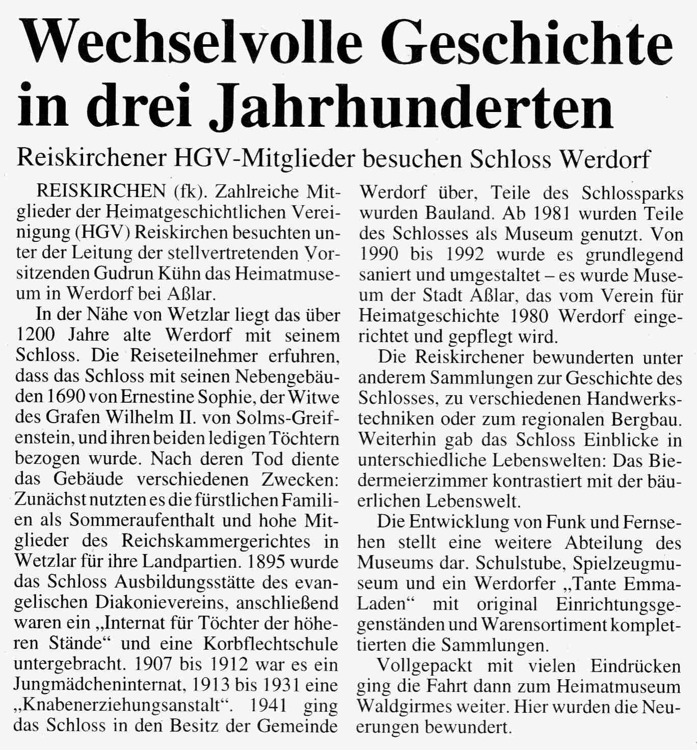 Wechselvolle Geschichte in drei Jahrhunderten - Reiskirchener HGV-Mitglieder besuchen Scloss Werdorf |