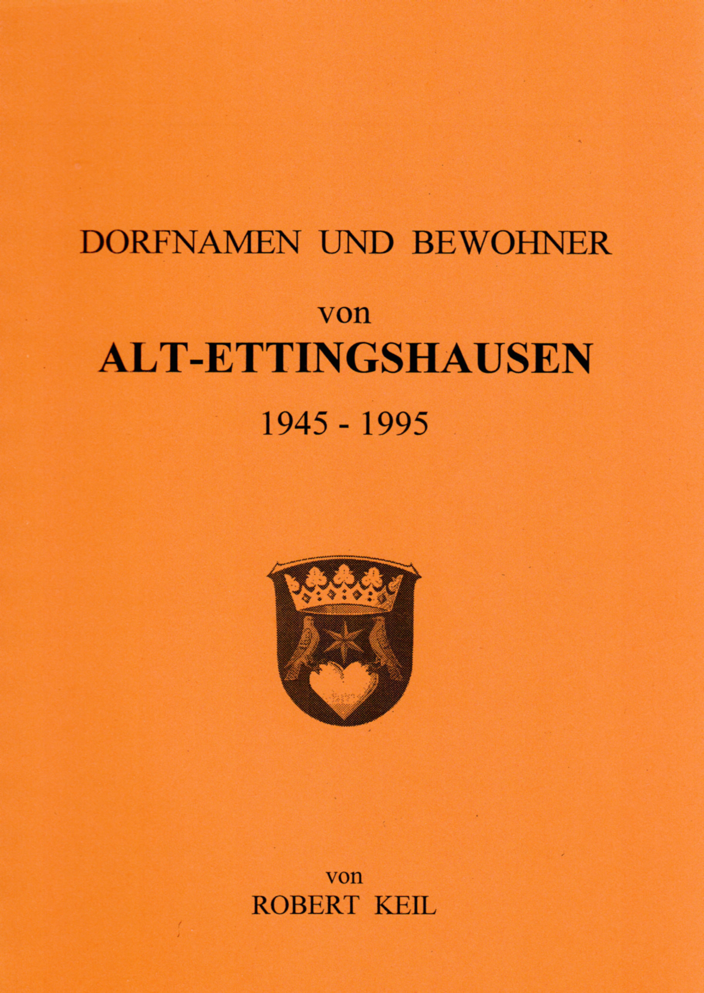 Autor: Keil, Robert Titel: Dorfnamen und Bewohner von Alt-Ettingshausen, 1945 -1995 Erscheinungsjahr: 1995, 2.Auflage 1996 Umfang: Ringbindung, 54 Bl. Inhaltsangabe: Auflistung des Hausbestandes und der Bewohner von 1945 bis 1995, mundartliche Dorfnamen, Ortsplan. |